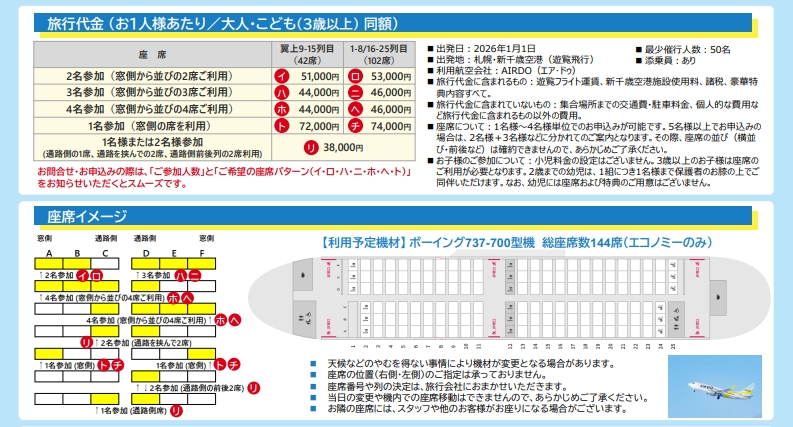 | 旅行代金に含まれるもの | 遊覧フライト運賃、新千歳空港施設使用料、諸税、豪華特典内容。 お問い合わせ・ご予約時に「ご希望の座席パターン(イ・ロ・ハ・ニ・ホ・ヘ・ト)」をお知らせください。 (お問い合わせフォームの「自由記入欄」にご記入下さい) |